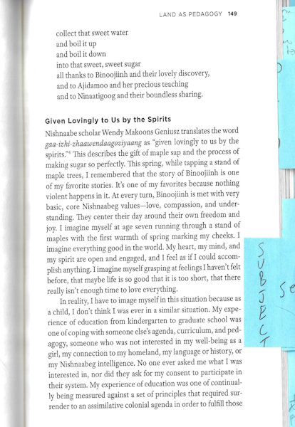 This procedure or practice of living, theory and praxis intertwined, is generated through relation with Michi Saagiig Nishnaabeg land that is constructed and defined by our intimate spiritual, emotional, and physical relationship with it. The procedure is our grounded normativity. Living is a creative act, with self-determined making or producing at its core.