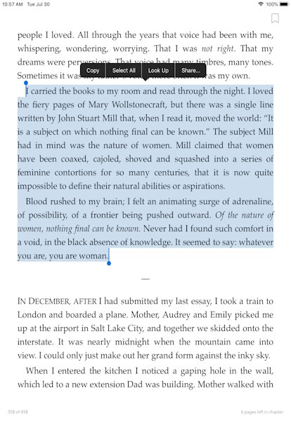 I felt an animating surge of adrenaline, of possibility, of a frontier being pushed outward. “Of the nature of women, nothing final can be known. Never had I found such comfort in a void, in the black absence of knowledge. It seemed to say: whatever you are, you are woman.