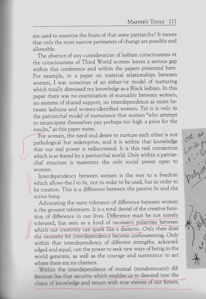 …Difference must not be merely tolerated, but seen as a fund of necessary polarities between which our creativity can spark... Only within that interdependency of different strengths, acknowledged and equal, can the power to seek new ways of being in the world generate, as well as the courage and sustenance to act where there are no charters.
