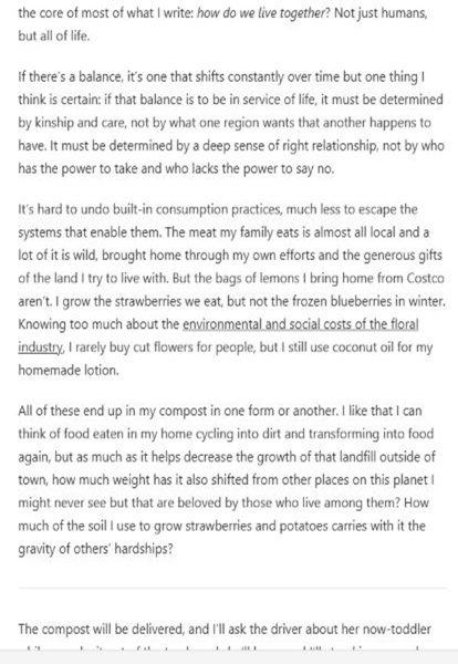 …if that balance is to be in service of life, it must be determined by kinship and care, not by what one region wants that another happens to have. It must be determined by a deep sense of right relationship, not by who has the power to take and who lacks the power to say no.