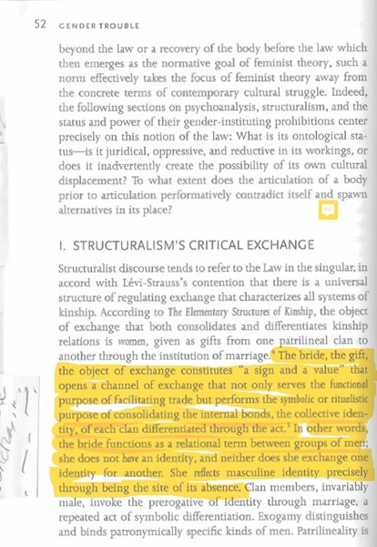 In other words, the bride functions as a relational term between groups of men; she does not have an identity, and neither does she exchange one identity for another. She reflects masculine identity precisely though being the site of its absence.