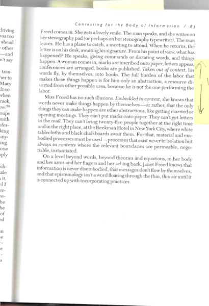Miss Freed has no such illusions. Embedded in context, she knows that words never make things happen by themselves – or rather that the only things they can make happen are other abstractions, like getting married or opening meetings. They can’t put marks onto paper.