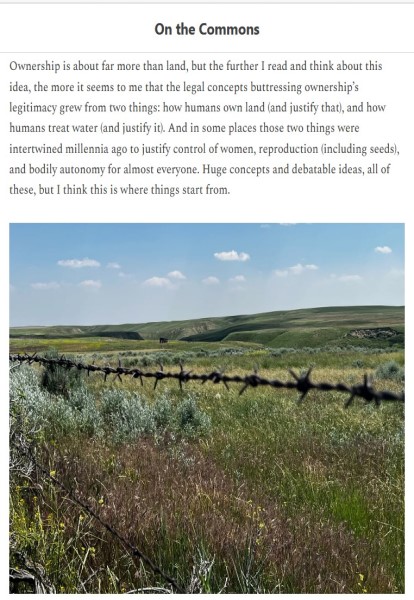 …the legal concepts buttressing ownership’s legitimacy grew from two things: how humans own land (and justify that), and how humans treat water (and justify it). And in some places those two things were entwined a millennia ago to justify control of women, reproduction (including seeds), and bodily autonomy for almost everyone.
