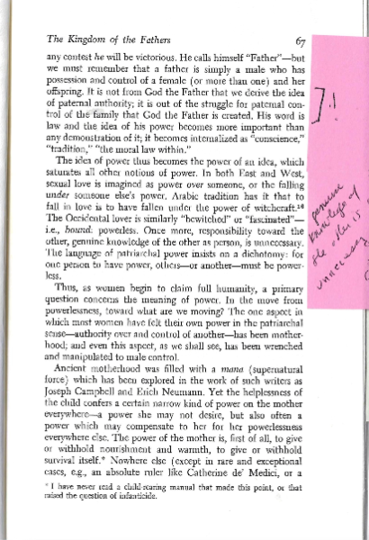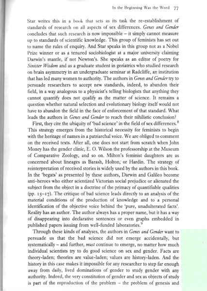 Power and authorship fabricate reality. The patriarchal voice of sociobiology is less the effusive sexism that ripples over the whole plane of the text than it is the logic of domination embedded in fashioning the tool of the word.