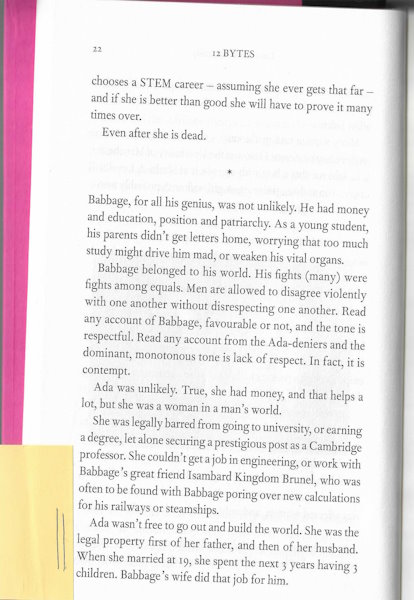Ada wasn’t free to go out and build the world. She was the legal property first of her father and then of her husband. When she married at 19, she spent the next 3 years having 3 children. Babbage’s wife did that job for him.