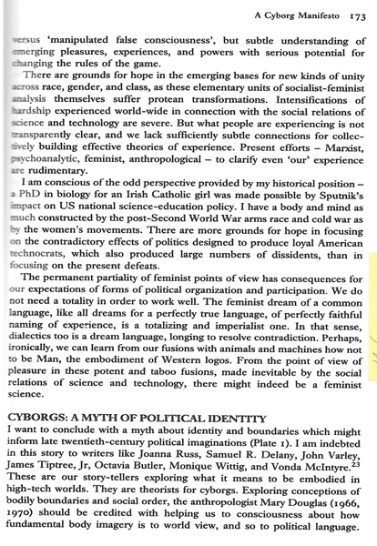 We do not need a totality in order to work well. …Perhaps, ironically, we can learn from our fusions with animals and machines how not to be Man, the embodiment of Western logos. From the point of view of pleasure in these potent and taboo fusions, made inevitable by the social relations of science and technology, there might indeed be a feminist science.