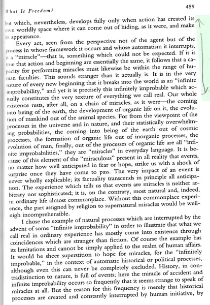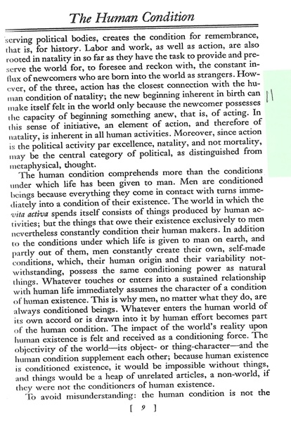 …However, of the three, action has the closest connection with the human condition of natality; the new beginning inherent in birth can make itself felt in the world only because the newcomer possesses the capacity of beginning something anew, that is, of acting….”