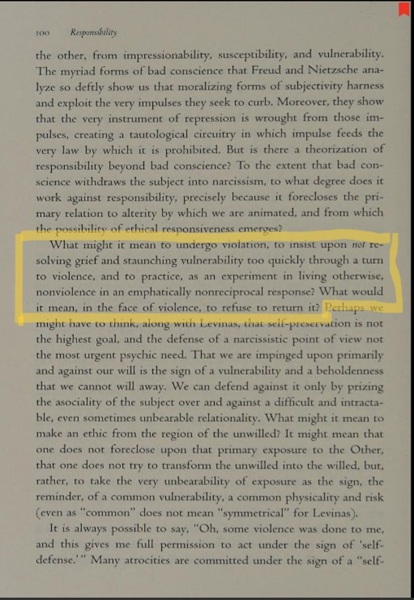 What might it mean to undergo violation, to insist upon not resolving grief and staunching vulnerability too quickly through a turn to violence, and to practice, as an experiment in living otherwise, nonviolence in an emphatically nonreciprocal response? What would it mean, in the face of violence, to refuse to return it?