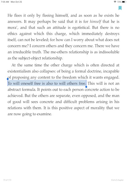 …since the individual is defined only by his relationship to the world and to other individuals, he exists only by transcending himself, and his freedom can be achieved only through the freedom of others. He justifies his existence by a movement which, like freedom, springs from his heart but which leads outside of him.