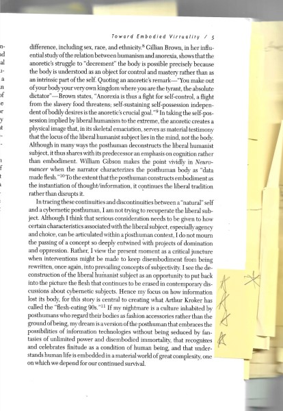 If my nightmare is a culture inhabited by posthumans who regard their bodies as fashion accessories rather than the ground of being, my dream is a version of the posthuman that embraces the possibilities of information technologies without being seduced by fantasies of unlimited power and disembodied immortality, that recognizes and celebrates finitude as a condition of human being, and that understands human life is embedded in a material world of great complexity, one on which we depend for our continued survival.