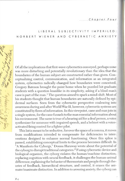 Of all the implications that first wave of cybernetics conveyed, perhaps none was more disturbing and potentially revolutionary than the idea that the boundaries of the human subject are constructed rather than given. Conceptualizing control, communication, and information as an integrated system, cybernetic radically changed how boundaries were conceived.