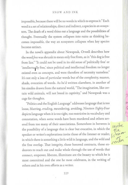 Somewhere in between is the possibility of a language that is clear but evocative, in which the speaker or writer’s explorations invite those of the listener or reader, in which there is something a little wild in language, and the wild and the free overlap.