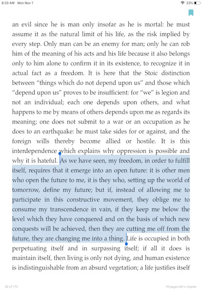 As we have seen, my freedom, in order to fulfill itself, requires that it emerge into an open future: it is other men who open the future to me, it is they who, setting up the world of tomorrow, define my future; but if, instead of allowing me to participate in this constructive movement, they oblige me to consume my transcendence in vain,...