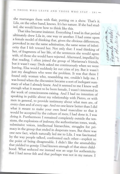 I had come upon a female model of thinking that, given the obvious differences, provoked in me the same admiration, the same sense of inferiority that I felt toward her. Not only that: I read thinking of her, of fragments of her life, of the sentences she would agree with, of those she would have rejected.