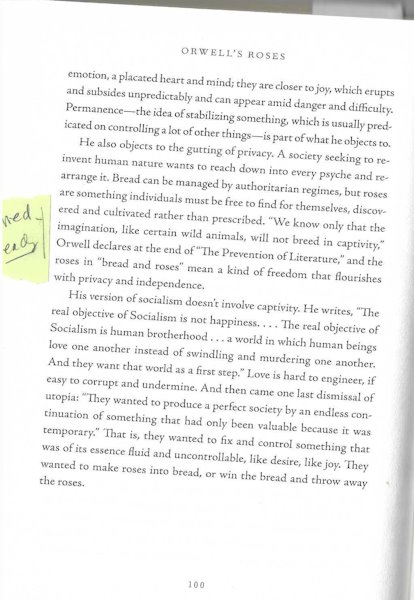 We know only that the imagination, like certain wild animals, will not breed in captivity,” Orwell declares at the end of “The Prevention of Literature,” and the roses in “bread and roses” mean a kind of freedom that flourishes with privacy and independence.